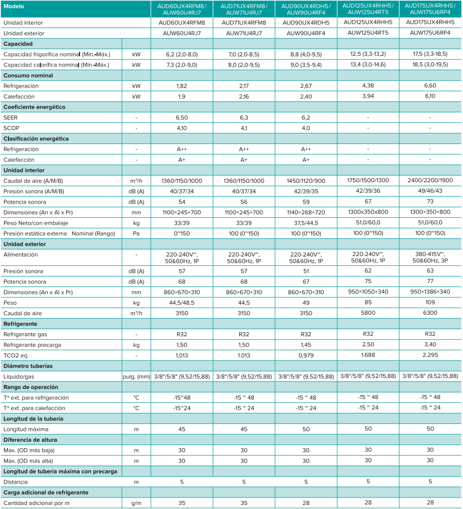 - Instalación: En falso techo mediante red de conductos