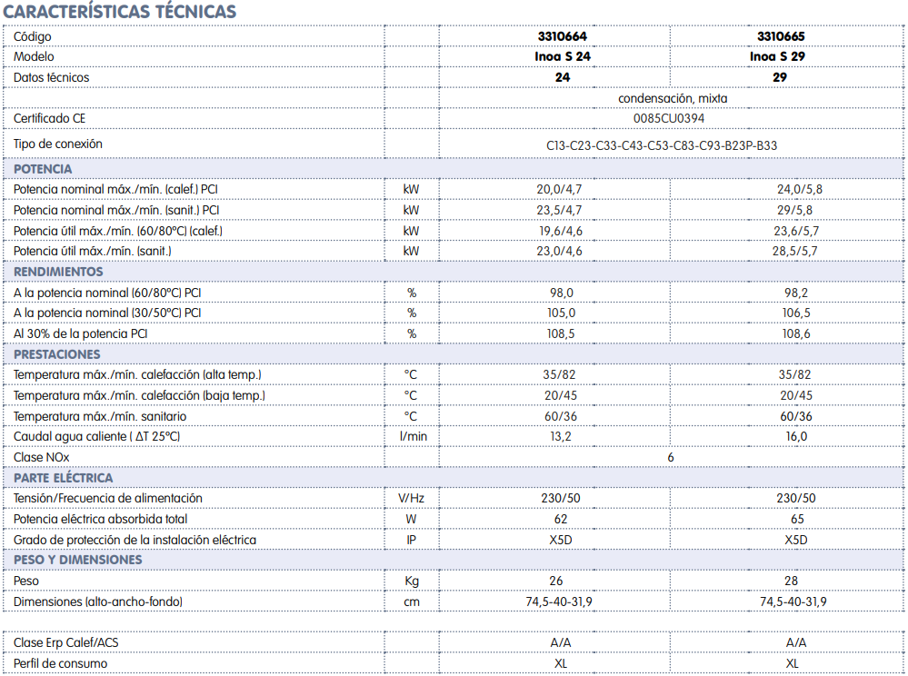 La Chaudière à gaz condensation Chaffoteaux INOA S 24 est une chaudière à gaz mixte instantanée de 23,5 KW avec un design compact et léger et facile à utiliser grâce à son écran LCD. Il offre également d'importantes économies grâce à son efficacité énergétique tant pour le chauffage que pour l'eau chaude.